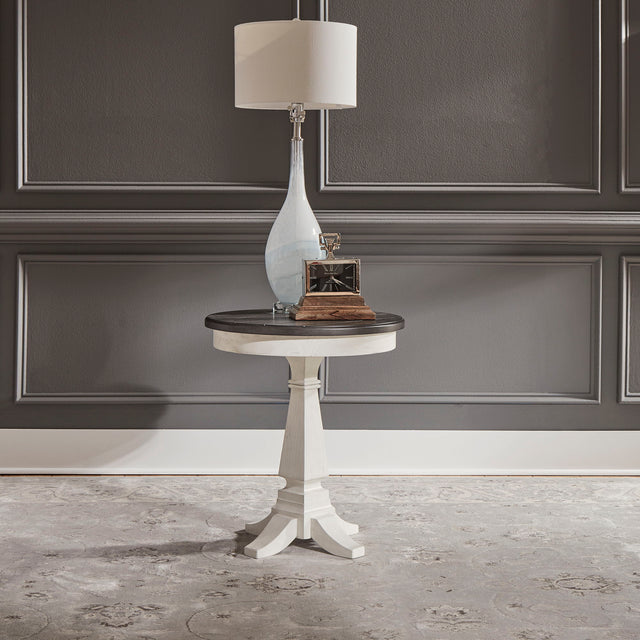 Accent your living space with the Allyson Park chair side table. Crafted of pine and rubberwood solids with cathedral white oak tops, this piece features a wire brushed white finish with a charcoal top, planked top, and is anchored by a square turned pedestal base with flared out feet. This table is perfect for creating a classic look while maintaining a casual feel.