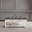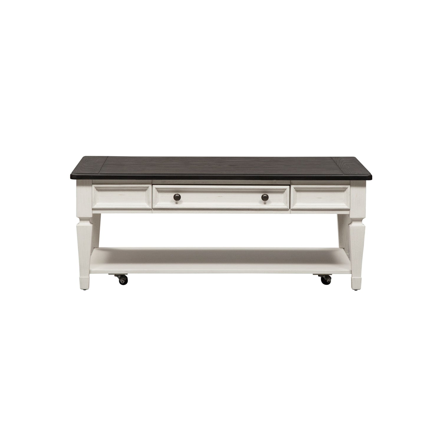 Accent your living space with the Allyson Park rectangular cocktail table. Crafted of pine, rubberwood, and poplar solids with cathedral white oak tops and pine veneers, this piece features a wire brushed white finish with a charcoal top, full extension drawer glides for easy access to storage, planked top, bead molding accents, one drawer, a bottom shelf for additional storage, casters that make rearranging a breeze, square turned tapered legs, and is accented by antique pewter knob hardware. This table is perfect for creating a classic look while maintaining a casual feel.