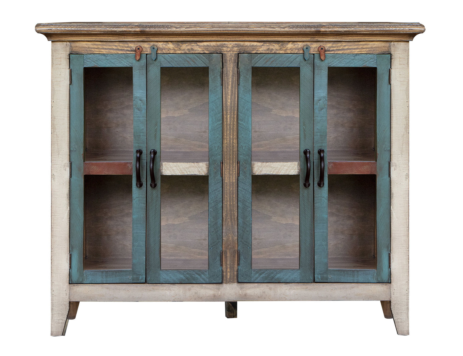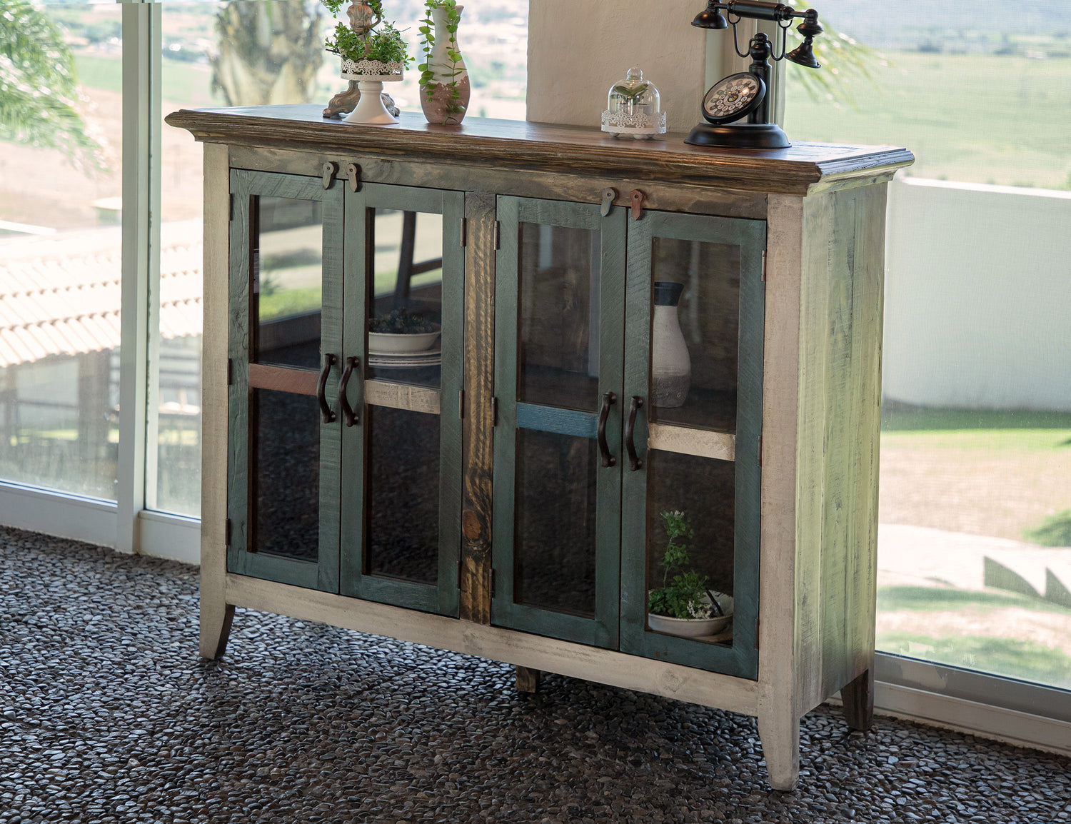 4 Glass Door 50" Console. The Antique collection is meticulously crafted from solid pine wood, featuring a captivating hand-distressed look in a multicolor finish. This collection serves as the perfect rustic addition to your home.