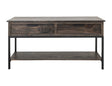 2 Drawer, 1 Shelf Sofa Table. Inspired by transitional design, the Dark Mita occasional tables elegantly combine the warmth of wood with the sleek industrial style of metal elements. Each piece in this collection is expertly crafted from sustainable mango and melina wood, hand-distressed to create a captivating finish that showcases its natural grain patterns. In addition to its attractive design, the Dark Mita collection offers practical features. The sofa table includes a sturdy metal base for support, a spacious tabletop for everyday use, two drawers with sleek black handles for storage, and a lower shelf ideal for displaying decorative items or organizing books and magazines. This combination of style and utility ensures the Dark Mita collection is a beautiful and functional addition to any living space.