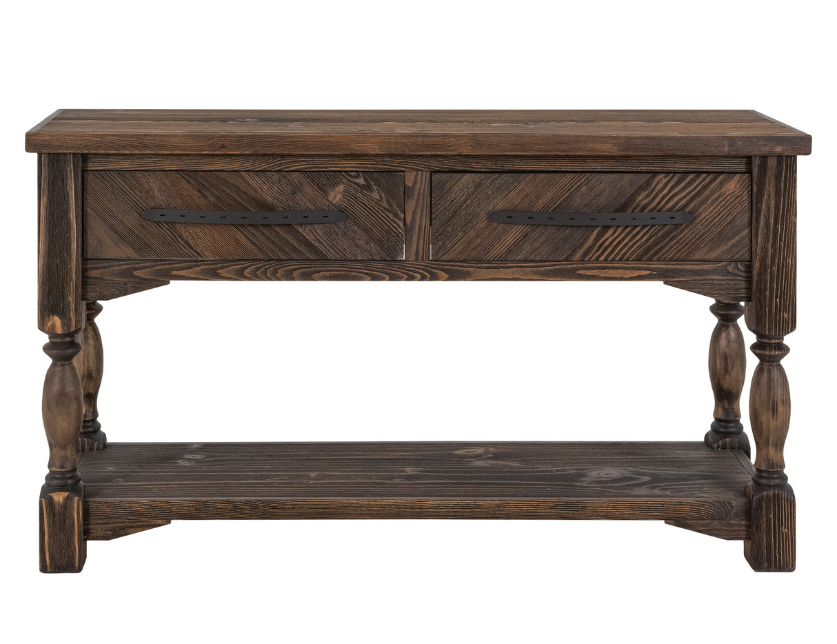 2 Drawer, Console. The Dutton Sofa Console combines elegance and simplicity. It represents stability in a changing world and brings a sense of peace and connection. This console, made from various wood species, boasts unique grain patterns and is designed for durability. Its lightly distressed surface features a brown lacquer finish that highlights the natural beauty of the wood. The console has elegantly turned legs that add a classic touch. It also offers two spacious drawers adorned with unique custom metal pulls, finished with a matte powder coating to resist chipping. The console features a lower shelf for extra storage or display, making it perfect for books, decor, or other essentials. Enhance your living space with the Dutton Sofa Console, where exquisite design meets practical functionality, creating a tranquil and stylish environment.