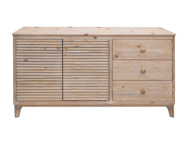 3 Drawer 2 Door Console. Drawing inspiration from ancient Egyptian architecture, the Giza collection, crafted from lightly distressed pine, pays homage to the intricate textures found in Protodoric columns. The gentle hues of these historic columns serve as a guiding influence in shaping the wood tones of this collection.