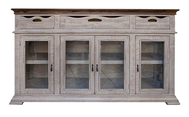 3 Drawer 4 Glass Door Console. Presenting the stunning Gray console, meticulously crafted from solid pine wood and featuring exquisite hand-carved drawers, elevating the ambiance of any room. Skillfully finished by our artisans, it boasts a sophisticated gray tone with deep brown accents on the tops, adding a touch of elegance to your space.