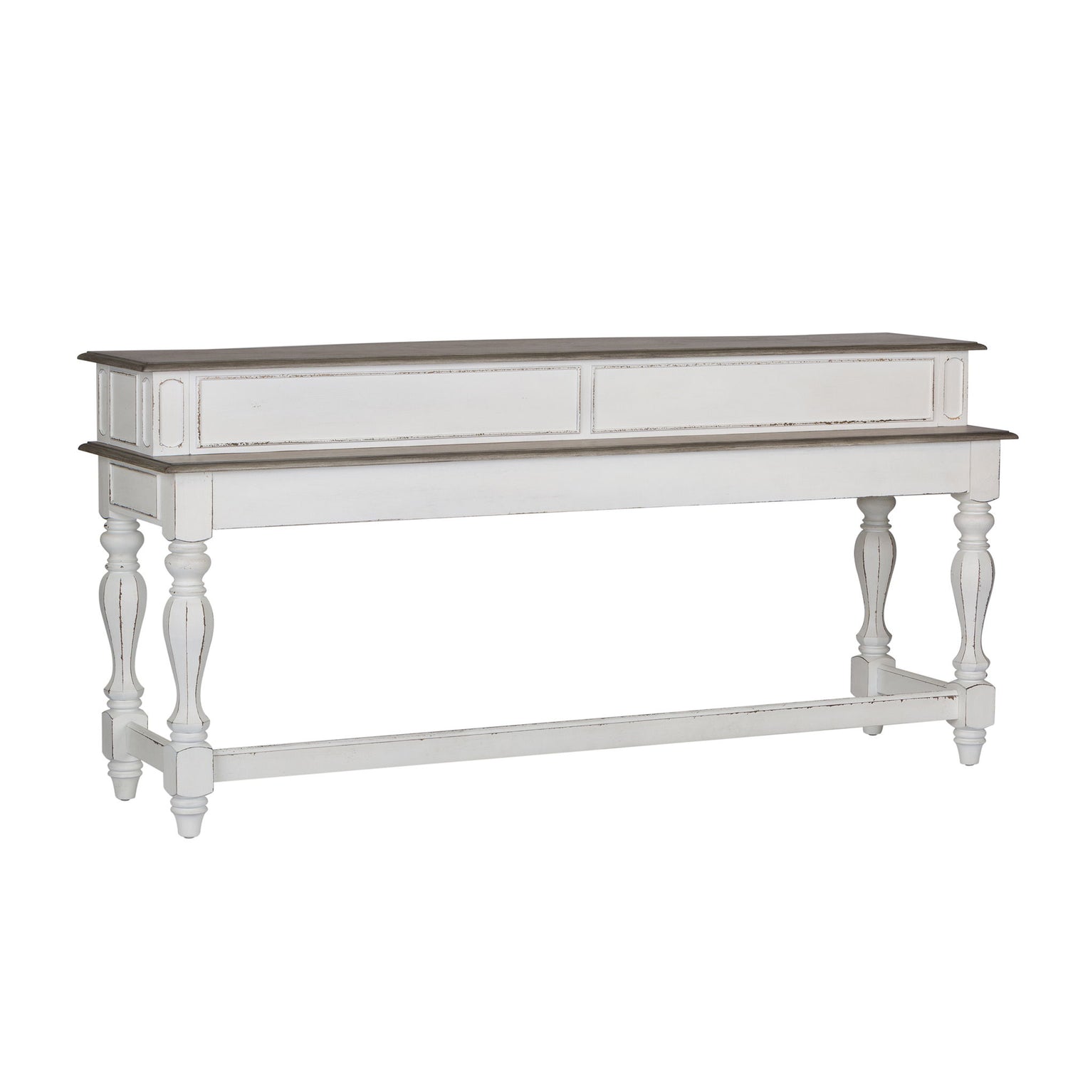 Accent your space with the perfect blend of European design with the Magnolia Manor console bar table. Crafted of poplar solids with white oak and birch veneers, this piece is ideal for the space behind the sofa by creating the perfect bar height serving area. This console bar features a fancy face top finished in a weathered brown with whitewash, bead molding, faceted turned legs, and three separate storage compartments. Warm antique finishes and artistic distressing along with grand scale create a piece to be passed to generations.