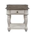 Accent your space with the perfect blend of European design with the Magnolia Manor end table. Crafted of poplar solids with white oak and birch veneers, this piece features a fancy face top in a weathered brown with whitewash, canted corners, faceted turned legs, one fully stained interior drawer with full extension drawer glides making access to storage a breeze, and framed drawer fronts with bead molding for added style and dimension, accented by antique pewter knob hardware. Users can enjoy the convenience of added storage for items from magazines, to cozy throw blankets with the bottom shelf. Warm antique finishes and artistic distressing along with grand scale create a piece to be passed to generations.