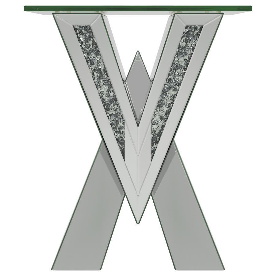 Taffeta V-Shaped Mirrored Entryway Console Table - Silver with Crystal Accents and Beveled Glass Top, Modern Luxury for Your Space