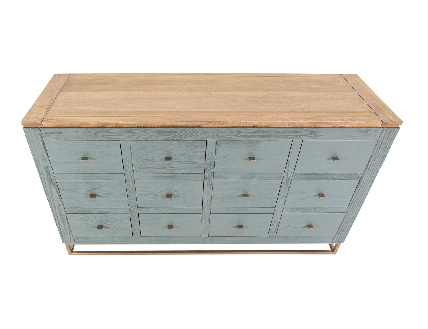 12 Drawer, Console. The Timber Console is a remarkable furniture piece that beautifully combines functionality with style. Designed to enhance any room, it features 12 spacious drawers, providing generous storage space for all your essentials while keeping your living area organized and clutter-free. Crafted from high-quality pine and poplar wood, the console showcases a rich, multi-step lacquer in an eye-catching green finish, accented by a hand-rubbed brown top that enhances the wood's natural beauty. The console is supported by a sleek, modern metal base in a sophisticated gold finish, adding a touch of luxury and elegance to its overall design. Whether used in a living room, hallway, or entryway, The Timber Console is not just a storage solution; it's a striking statement piece that elevates your home decor.
