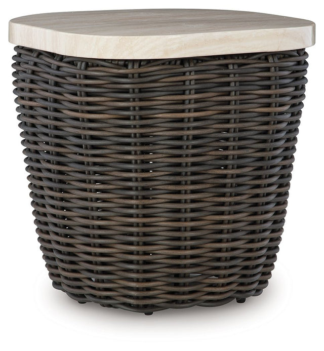 Add luxury, convenience and durability to alfresco fun. This outdoor end table captures the textural beauty of wicker while withstanding the elements, from rain to shine. With its marble-look aluminum top, you can stylishly keep your pool-side drinks or reads in reach.