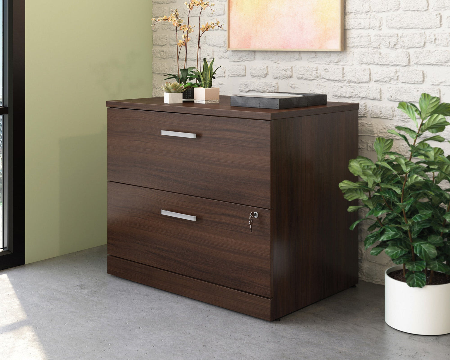 The Affirm Lateral File Cabinet provides secure and spacious storage in a timeless Classic Cherry finish. With two locking full-extension drawers, it accommodates letter, legal, and European files while preventing clutter. Fully assembled for convenience and designed with durability in mind, it’s a reliable and stylish solution for professional or home offices.