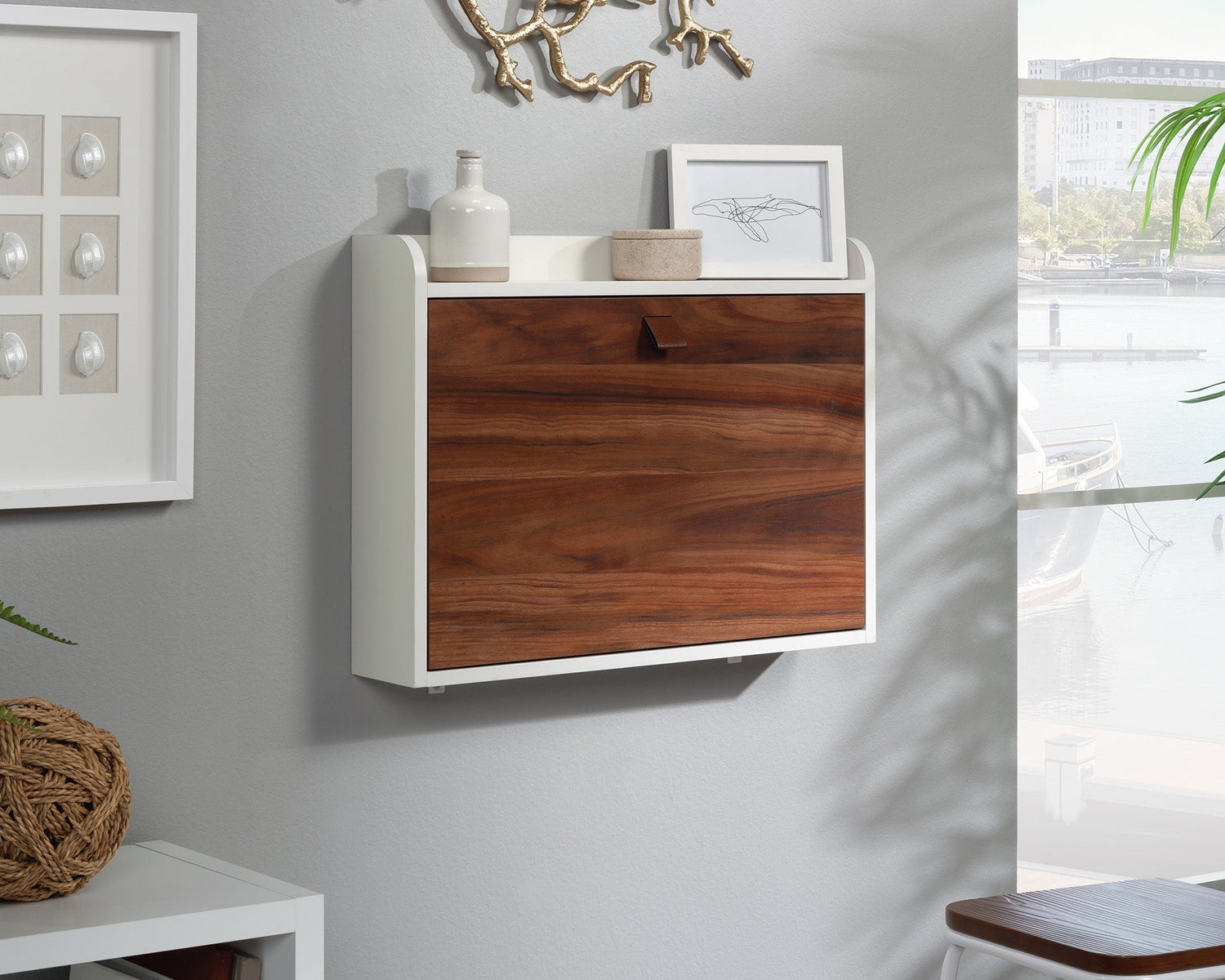 Finished in Pearl Oak with Blaze Acacia accents, this floating desk adds contemporary style to bedrooms, living rooms, or offices. Its upper display shelf provides extra space for décor or personal items.