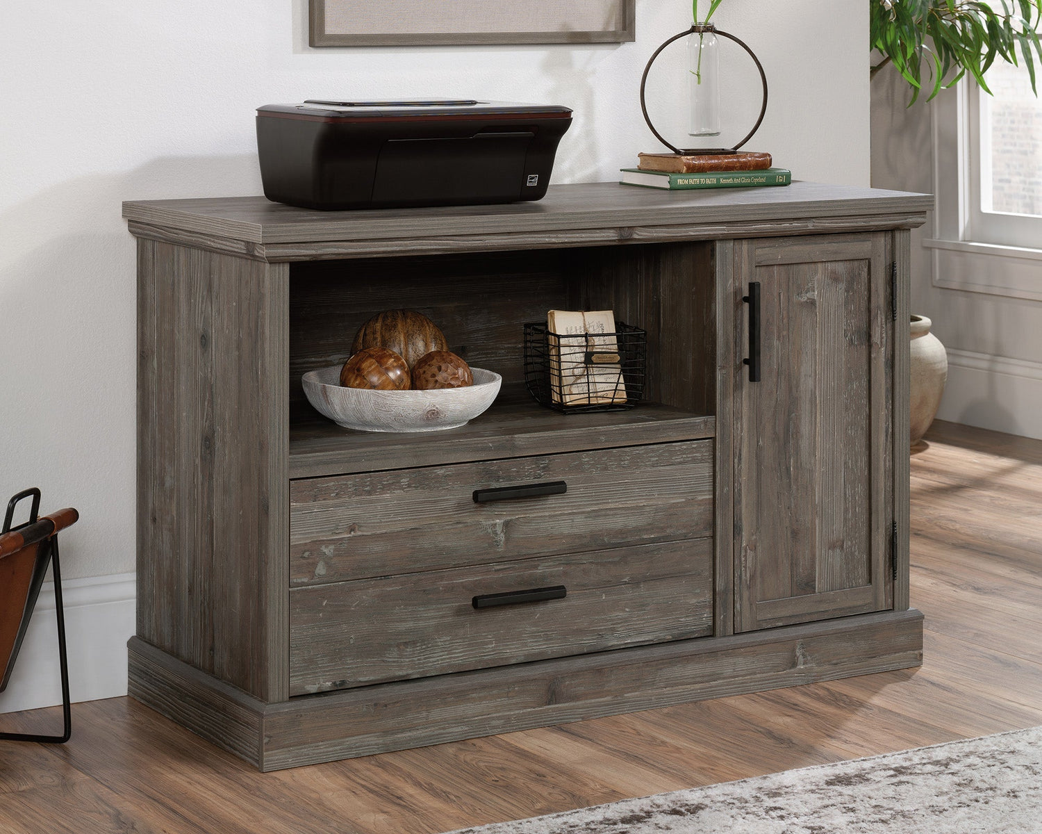 Aspen Post Small Credenza in Distressed Pebble Pine – Home Office File Cabinet with Adjustable Shelf, File Drawer, Durable 1" Top & Attractive Hardware