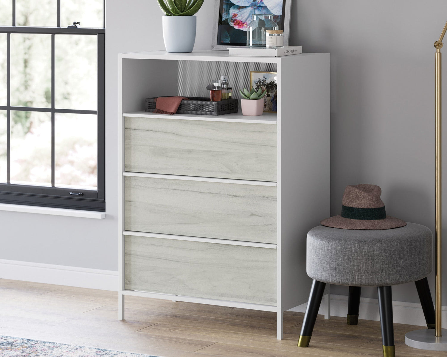 The Boulevard Café 3-Drawer Chest enhances your bedroom with versatile storage and sleek design. Featuring three drawers, a spacious open shelf, and a roomy top surface, it provides space for clothing, accessories, and décor. Finished in white with Haze Acacia accents, it’s supported by a durable powder-coated frame for everyday use.