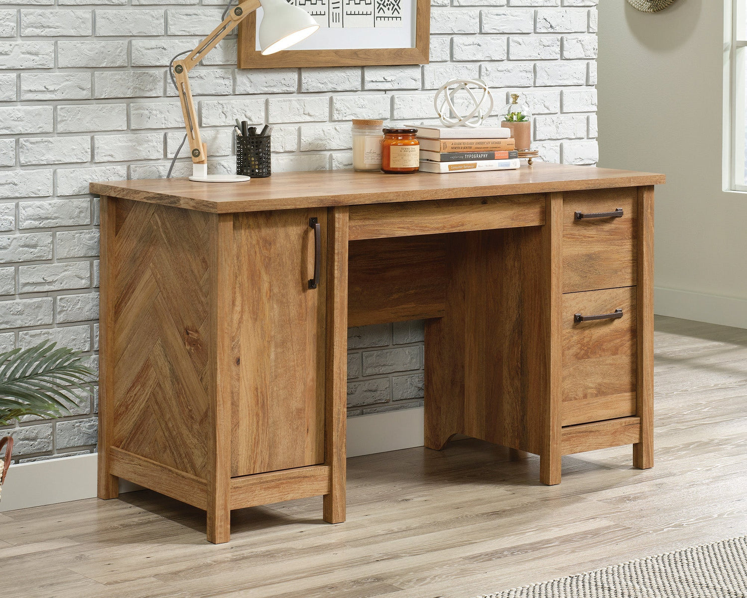This desk includes a hidden storage area behind a door with an adjustable shelf, ideal for a vertical CPU tower or extra office supplies. Finished on all sides with a stylish herringbone pattern on the side panels, it brings a charming, detailed look to your workspace.