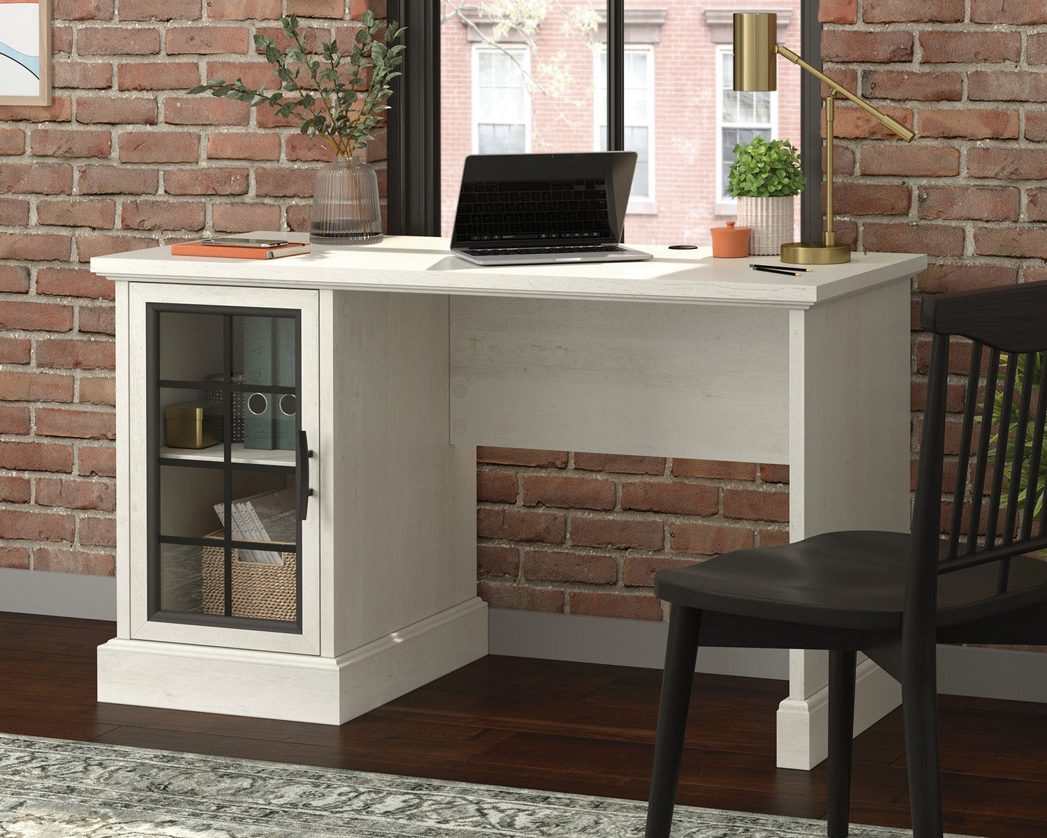 Carolina Grove Single Pedestal Desk in Winter Oak – Home Office Writing Desk with Glass Door Storage, Adjustable Shelf & Grommet Hole