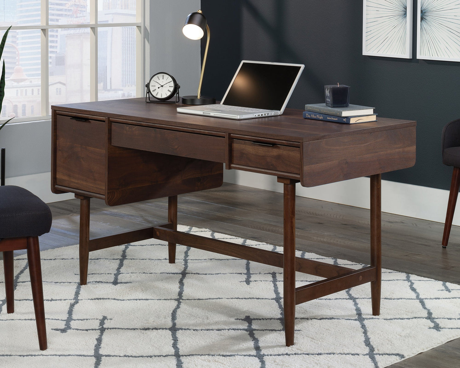 Finished in warm Grand Walnut with tapered legs, this desk is a stylish centerpiece for your home office. Features include a grommet hole for cord management and optional compatibility with a hidden wireless Qi charger, blending timeless design with modern functionality.