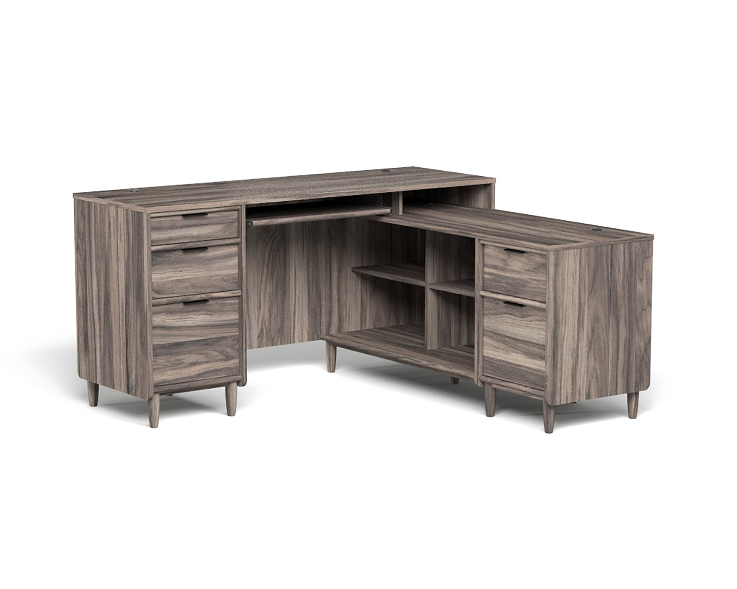 Clifford Place L-Shaped Desk in Jet Acacia with Cubby Storage, Keyboard Shelf, and File Drawers for Home Office Workspace