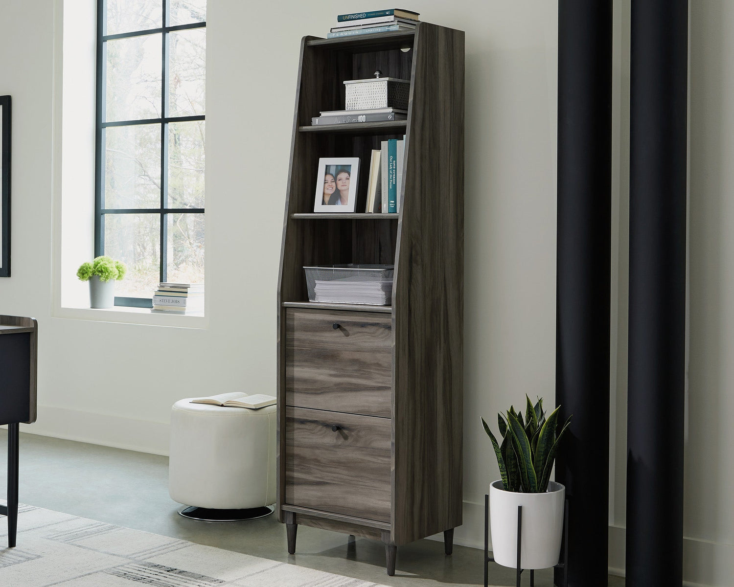Finished in Jet Acacia with solid wood feet detailing, this narrow storage bookcase combines functionality with modern design. The enclosed back includes cord access, keeping chargers and cords out of sight for a clean, polished look.