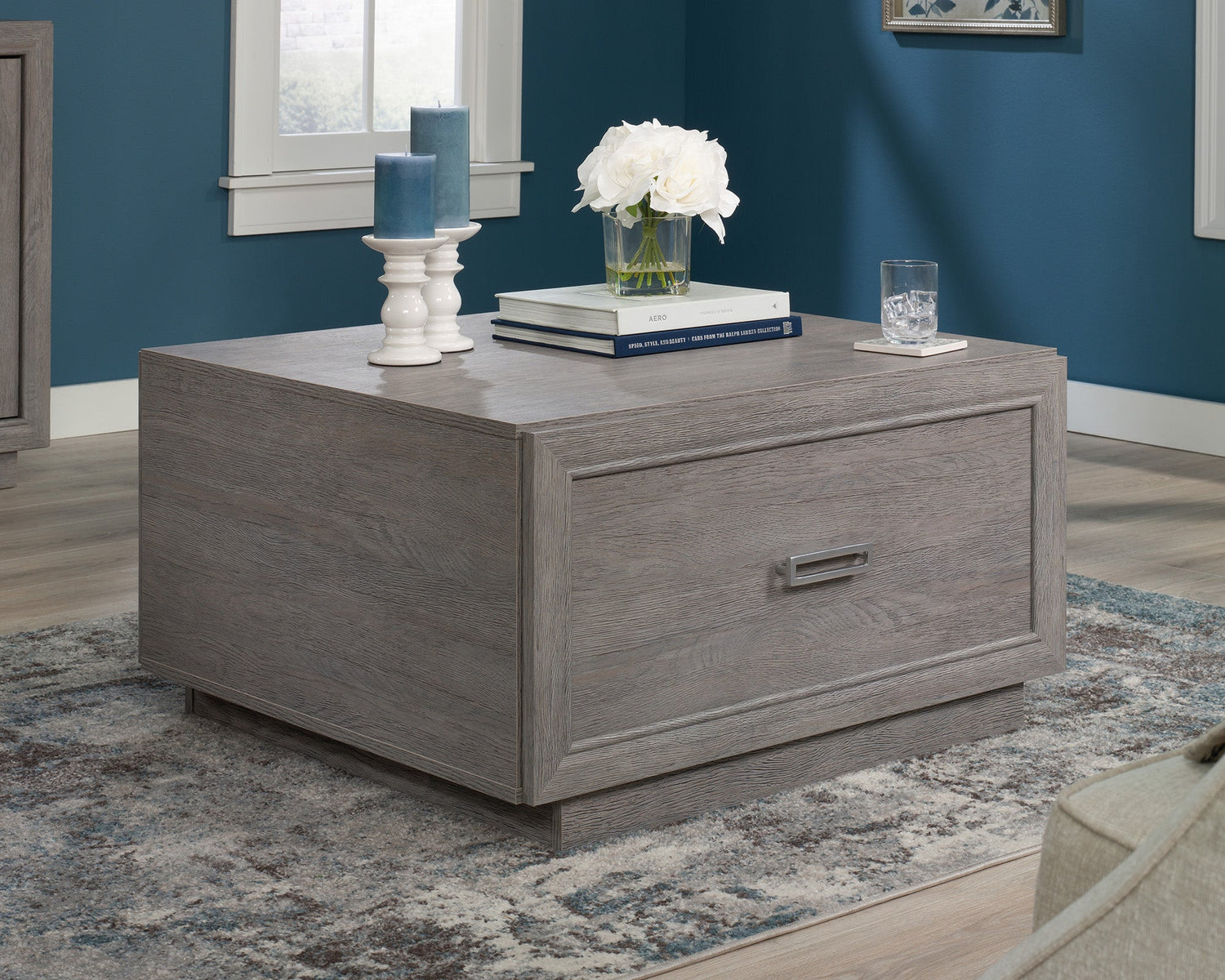 Hayes Garden Square Coffee Table in Ashen Oak – Living Room Storage Table with Drawer, Open Shelf & Geometric Hardware Accents