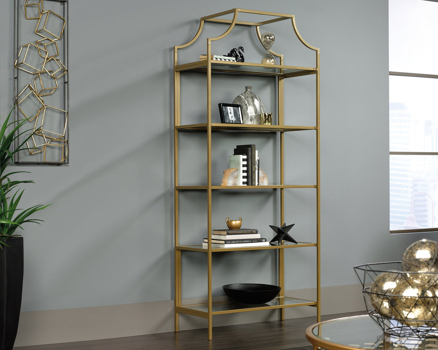 Add modern sophistication to your home with the International Lux 5-Shelf Bookcase in Satin Gold. Featuring five tempered glass shelves, it provides a safe and elegant display for books, décor, or collectibles. Rounded edges and a curved indent design enhance its contemporary appeal, while the sturdy metal frame ensures long-lasting durability. Finished on all sides for versatile placement, this open-shelf bookcase blends function and style, making it ideal for living rooms, home offices, bedrooms, or entryways.