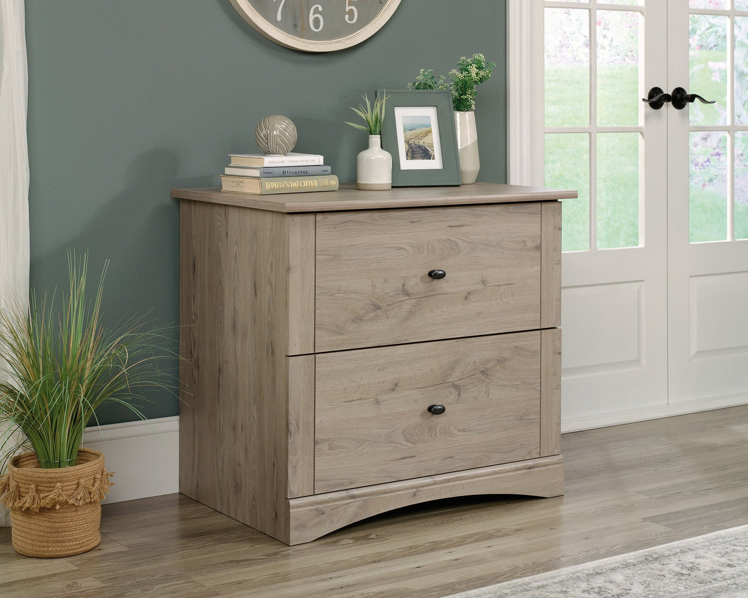 Upgrade your office with the Lateral File Cabinet in Laurel Oak from the Sauder Select collection, designed for organization and style. This 2-drawer cabinet features full-extension slides to hold letter or legal-size hanging files, keeping documents secure and easy to access. A patented interlocking safety mechanism allows only one drawer to open at a time, ensuring stability. Finished on all sides for flexible placement, it also offers a spacious top surface for a printer, lamp, or décor, combining function with modern appeal.