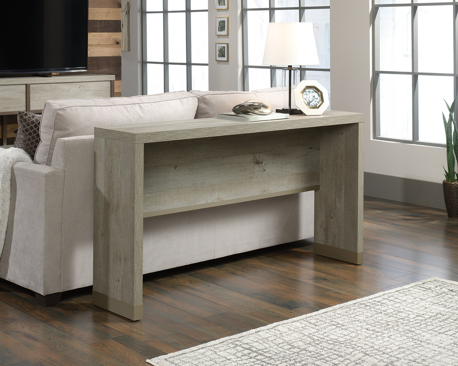 A touch of modern farmhouse beauty is just what your living room is missing. Add beautiful style and design to your home with this sofa table from the Manhattan Gate collection. This behind sofa table features a spacious top surface that provides you with the perfect amount of space to store and display a variety of different items like an accent lamp, decorative plants, your collection of knick-knacks and photos of your family and friends too. This narrow sofa table is finished on all sides for versatile placement throughout your home. Have it cozied up behind your couch or standing alone on a living room wall as a stunning accent piece. It looks great no matter where it stands! This modern sofa table also features powder coated metal end caps for an extra touch of detail that is sure to stand out in your home. Its strong and lightweight 1 ¾" panel construction makes it sturdy and easy to move. Finished in Mystic Oak, this one-of-a-kind sofa table is just what your living room needs.
