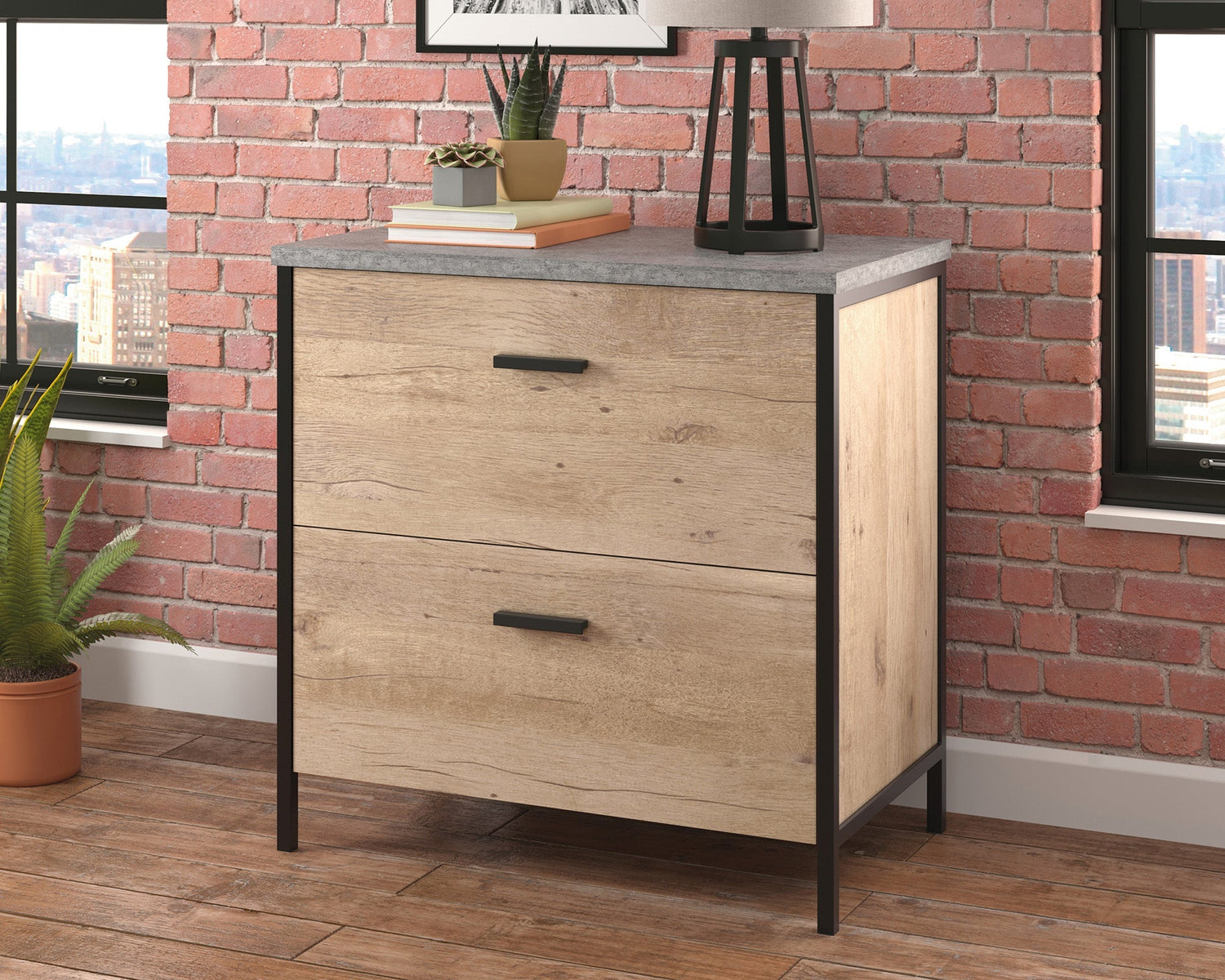 This lateral file cabinet from the Market Commons collection combines modern style with practicality. The Prime Oak finish with Slate Gray accents and powder-coated metal frame elevates your home office décor while providing organized storage for important documents. Finished on all sides, it looks polished from every angle.