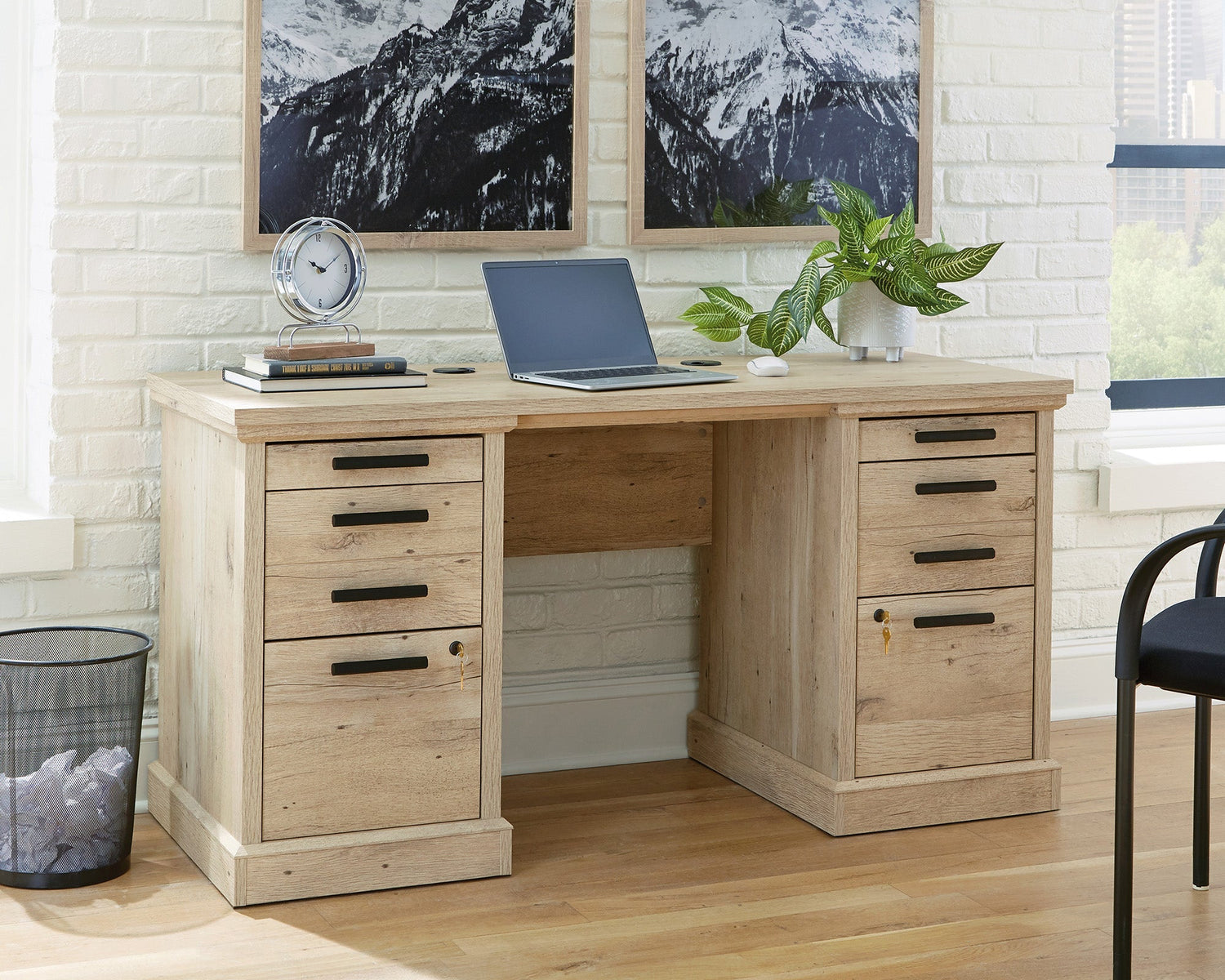 The Mason Peak 60" Knee Space Credenza in Prime Oak delivers durability, organization, and modern style for home or office settings. Its sturdy 1" melamine top resists daily wear, while six utility drawers and two locking file drawers with full-extension slides keep supplies and documents neatly stored. Built-in cord management ensures a clean workspace, and the fully finished design with light Prime Oak finish offers a polished, professional appearance. Pre-assembled components make setup quick and hassle-free.