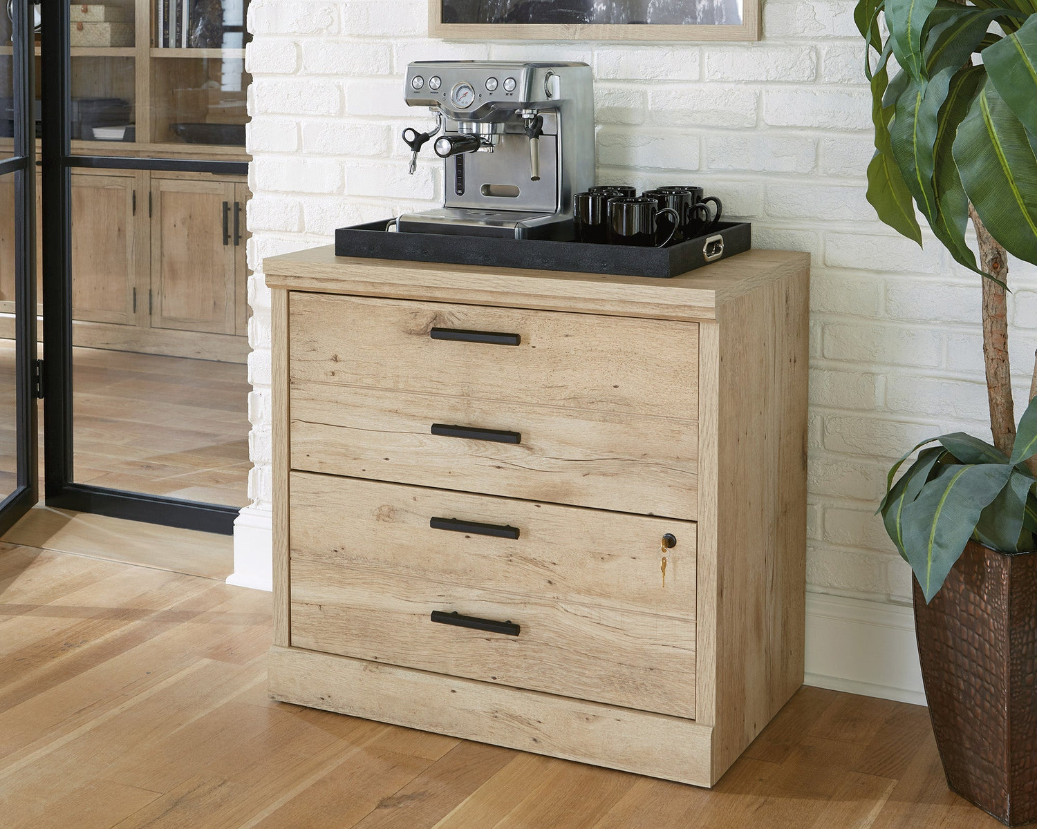 The Mason Peak 2-Drawer Lateral File Cabinet in Prime Oak combines style with functionality. Offering secure and organized document storage, this lateral file features fully extending drawers, a key lock system, and a safety interlocking mechanism. With its polished Prime Oak finish, it fits seamlessly into any professional setting.