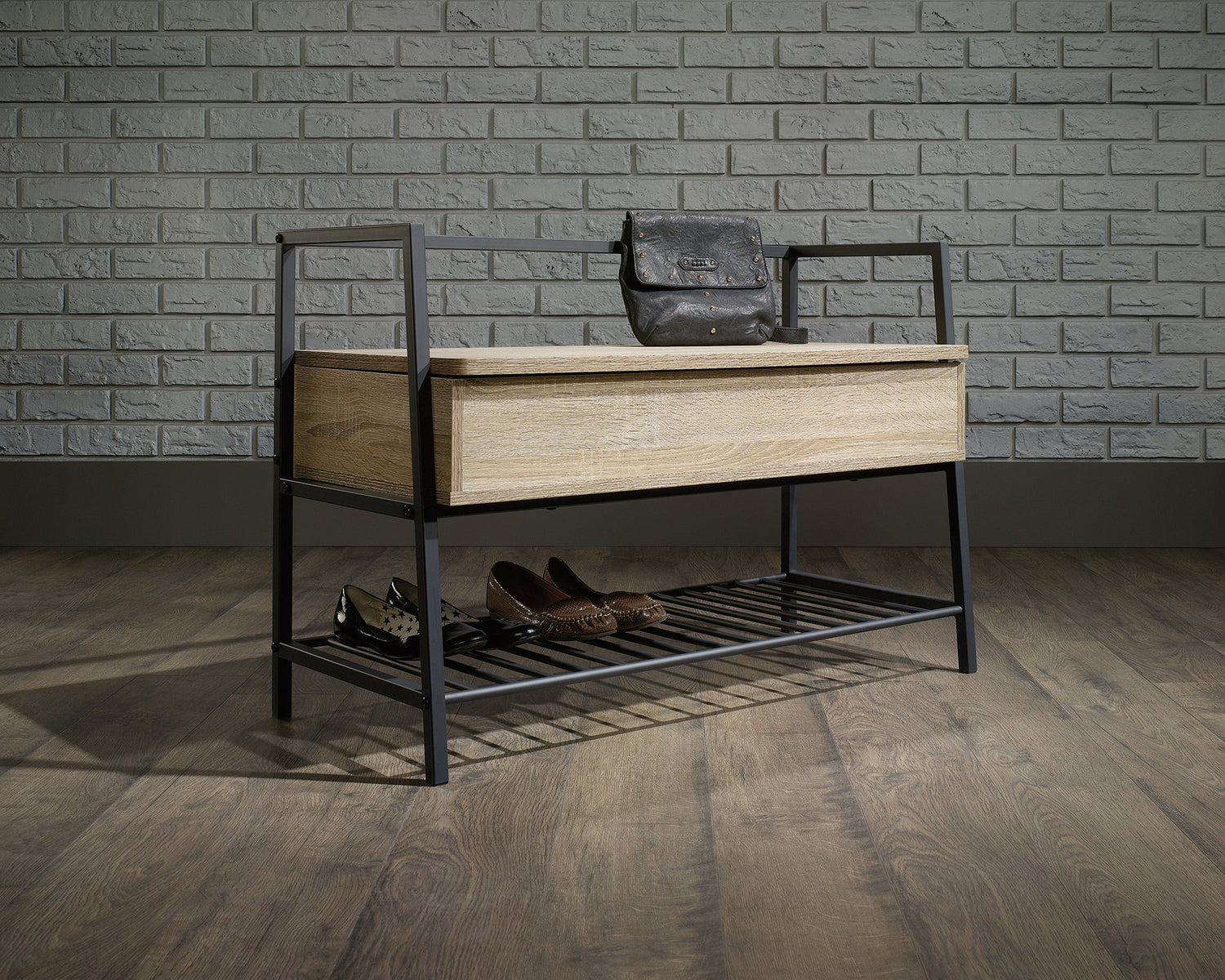 Enhance your home organization with the North Avenue Storage Bench in Charter Oak. The spacious seat flips up to reveal a hidden storage area with a divider, keeping blankets, books, jackets, and miscellaneous items neatly organized. The lower grate-style shelf provides additional storage for shoes or baskets. Crafted from durable engineered wood and a black metal frame, this bench is finished on all sides for versatile placement. Its simple industrial design makes it a stylish and practical addition to entryways, bedrooms, living rooms, or hallways, offering both functionality and seating for your home.