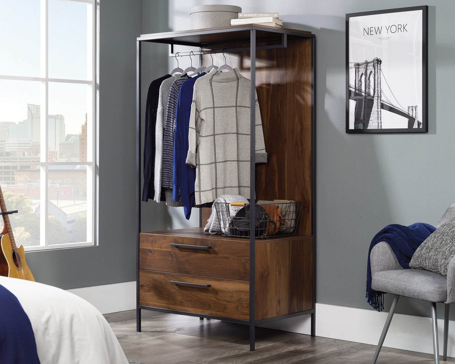 Maximize bedroom storage with the Nova Loft Armoire in Grand Walnut. This open wardrobe features a full-length hanging rod ideal for storing coats, dresses, shirts, and skirts, while two drawers with metal runners provide space for stacking denim, linens, and sweatshirts. Its industrial-inspired wood and powder-coated metal construction offers stability and durability, while the Grand Walnut finish gives your room a warm, contemporary look. Perfect for keeping your clothing and accessories organized without sacrificing style.