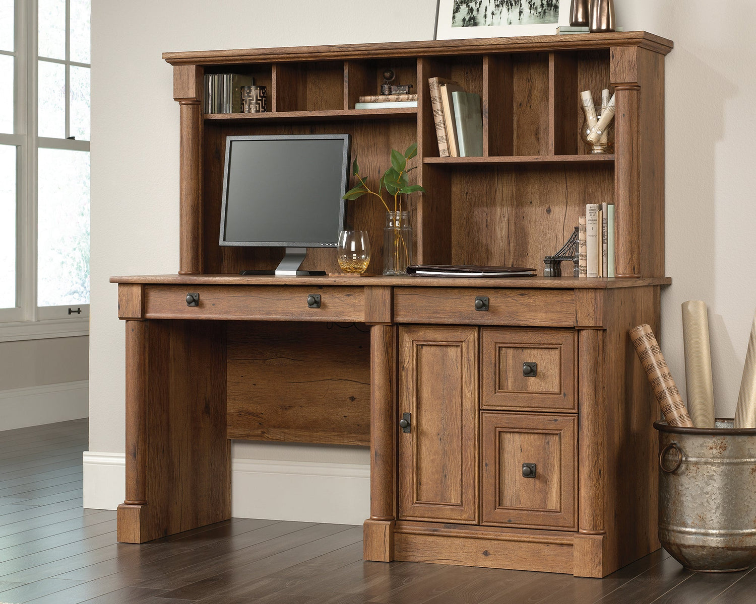 Palladia Computer Desk with Hutch in Vintage Oak – Spacious Workstation with Keyboard Shelf, Storage Drawers, Hutch, and Cord Management
