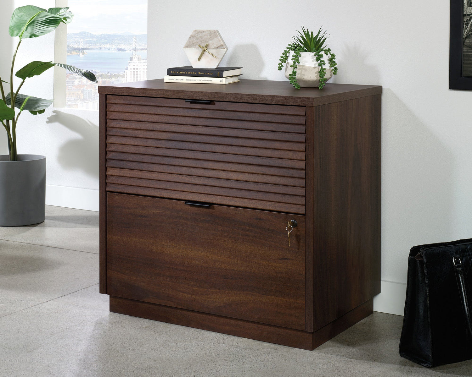 Finished in warm Spiced Mahogany, this 2-drawer lateral file cabinet combines modern resimercial style with functionality. Finished on all sides, it looks polished from every angle, while the spacious top surface supports décor, books, or a lamp for added versatility.