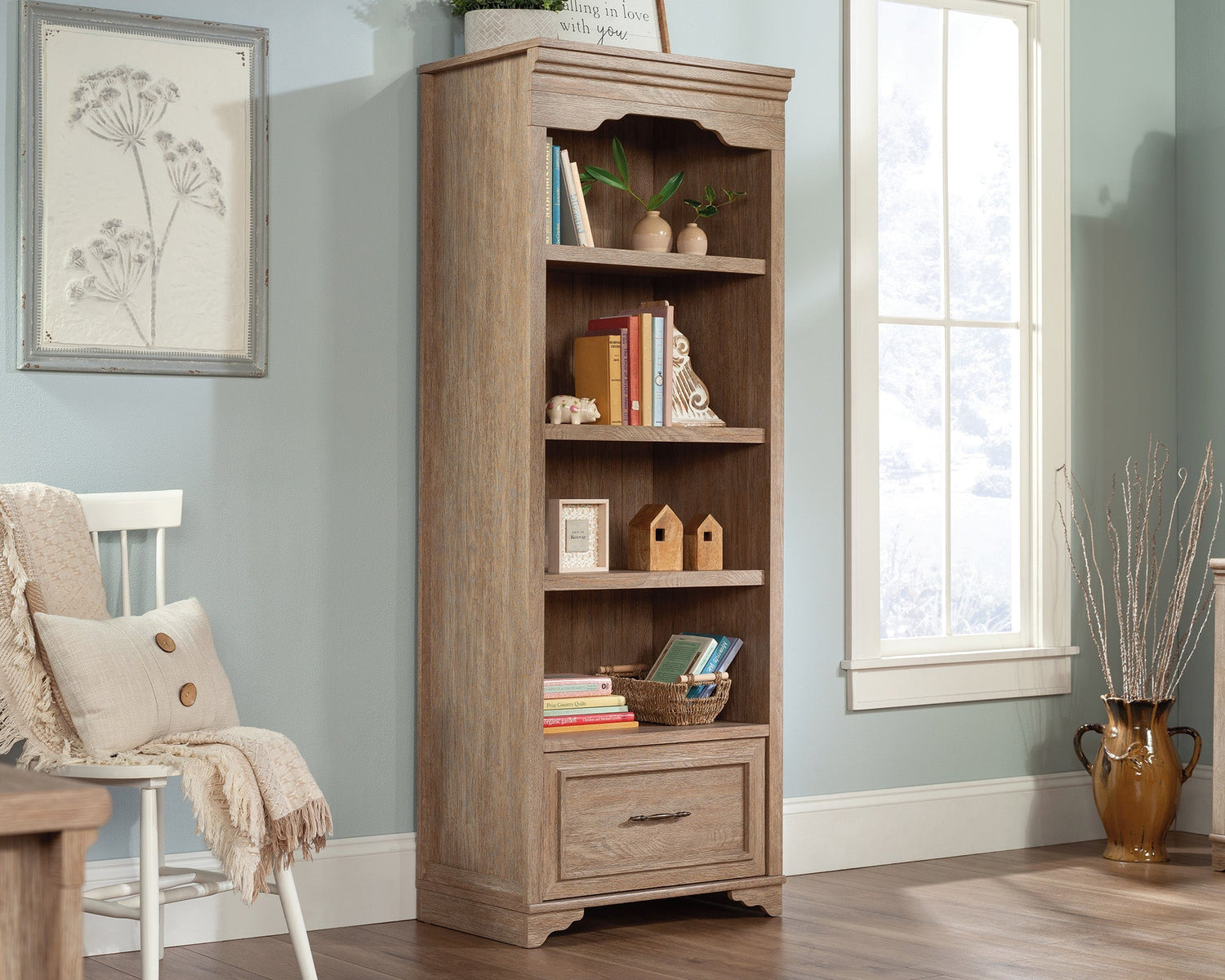 Elevate your home or office organization with the Rollingwood Country 4-Shelf Bookcase in Brushed Oak. This versatile piece features three adjustable shelves for books, décor, and collectibles, along with a lower drawer for hanging files or general storage. Finished on all sides for flexible placement, it combines timeless style with practical functionality, creating a polished, clutter-free space in any room.