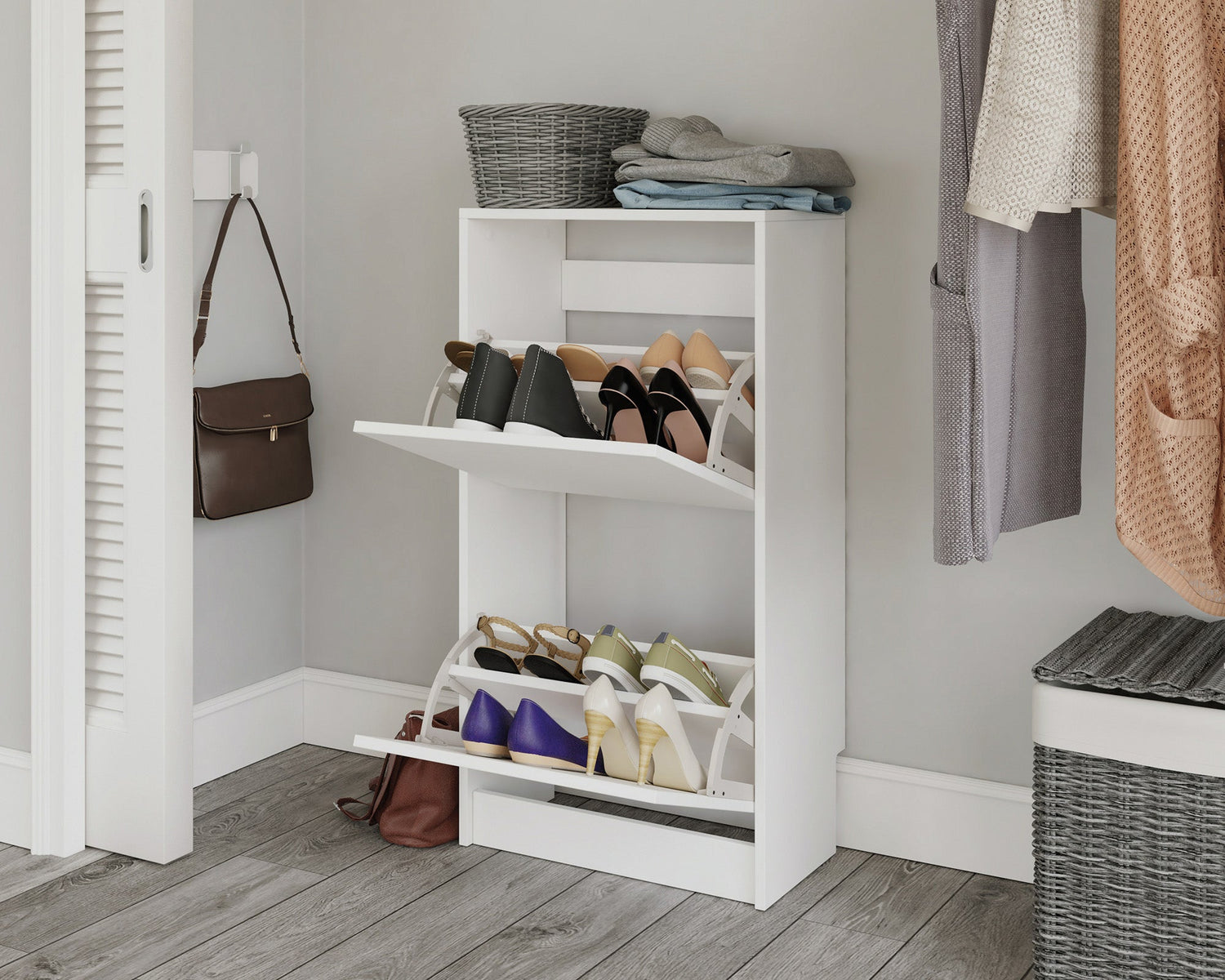Keep your entryway or bedroom tidy with the Shoe Storage Cabinet from the Sauder Select collection. Two tilt-out doors conceal shoe compartments, while its crisp White finish blends seamlessly with any décor for a clean, modern look.