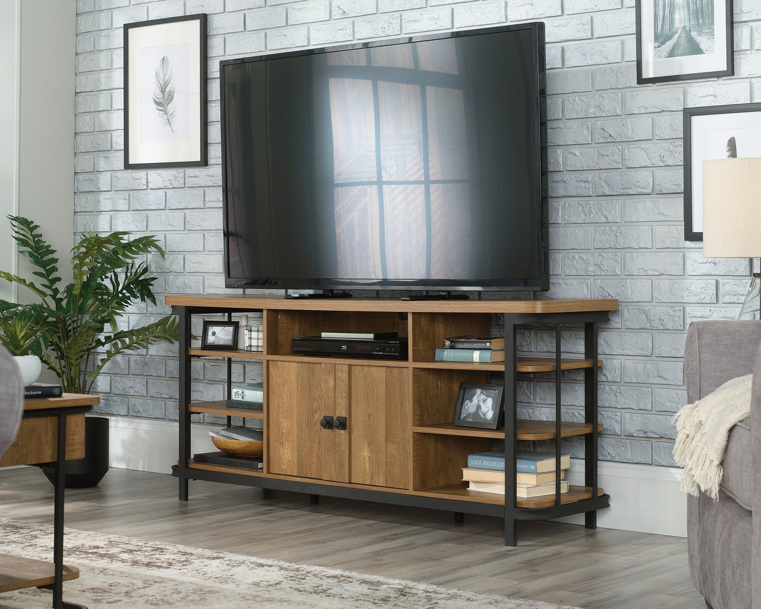 The Station House Entertainment Credenza in Etched Oak delivers rustic-inspired style with practical storage for your media space. Six open shelves and a cubbyhole offer room for décor and electronics, while a hidden cabinet with an adjustable shelf stores larger items. Designed to hold TVs up to 65", this wood-and-metal credenza is finished on all sides for flexible placement. With its industrial frame and warm oak finish, it’s the perfect balance of durability and charm.