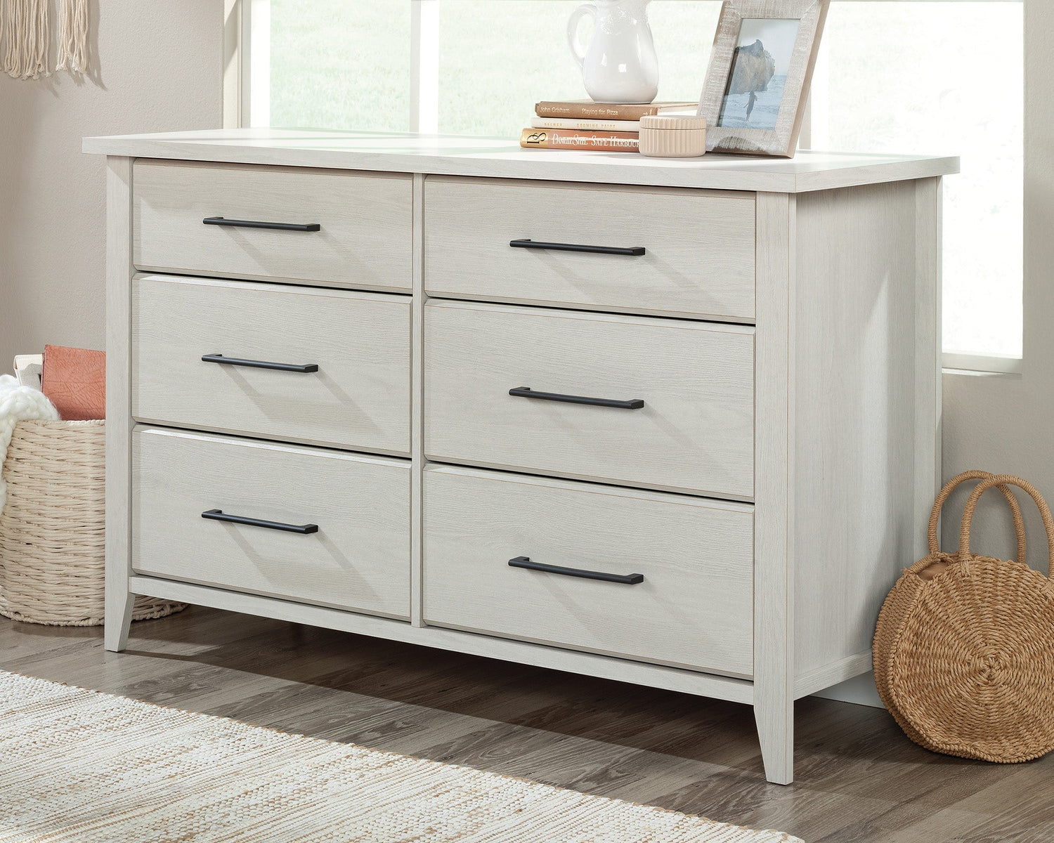 The Summit Station 6-Drawer Dresser in Glacier Oak combines modern style with functional storage. Its six spacious drawers, including extra-deep lower drawers, keep clothing, linens, and accessories organized. Smooth metal runners ensure ease of use, while the Glacier Oak finish, tapered feet, and chamfered edges enhance bedroom décor. The top surface provides additional display space for lamps, mirrors, and personal items, making this dresser a stylish and practical centerpiece.