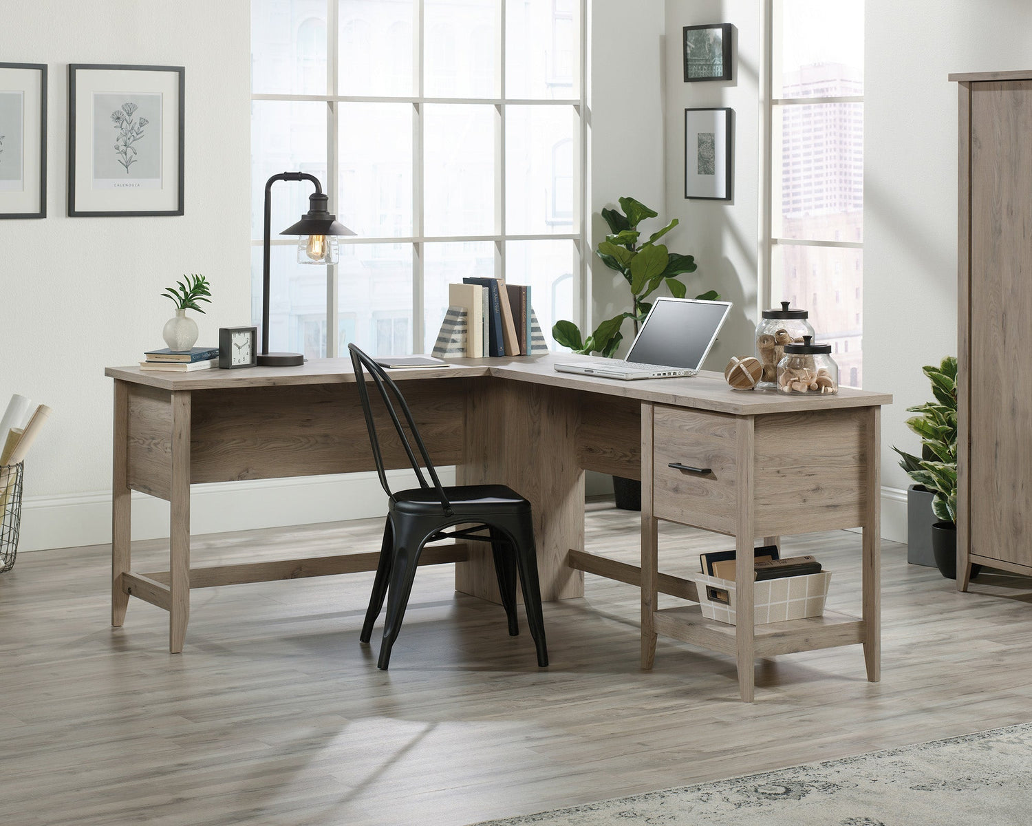 Summit Station L-Shaped Desk in Laurel Oak – Home Office Desk with File Drawer, Lower Shelf, Desktop Grommets & Versatile Placement