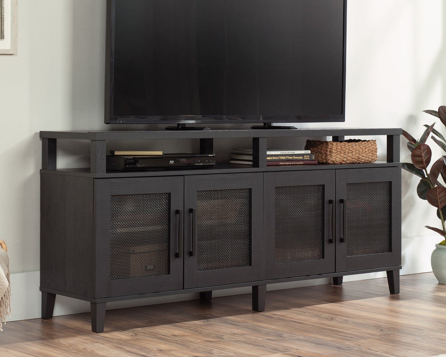 The Tiffin Line entertainment credenza in Raven Oak is a versatile addition to any living space. Its spacious top supports TVs up to 65, while open and hidden shelving provides room for electronics, DVDs, décor, and more. Adjustable interior shelves ensure flexible storage options, and decorative rattan inserts on the doors add visual interest. With cord management pass-throughs and sleek black hardware, this TV stand balances style, functionality, and organization in one elegant piece.