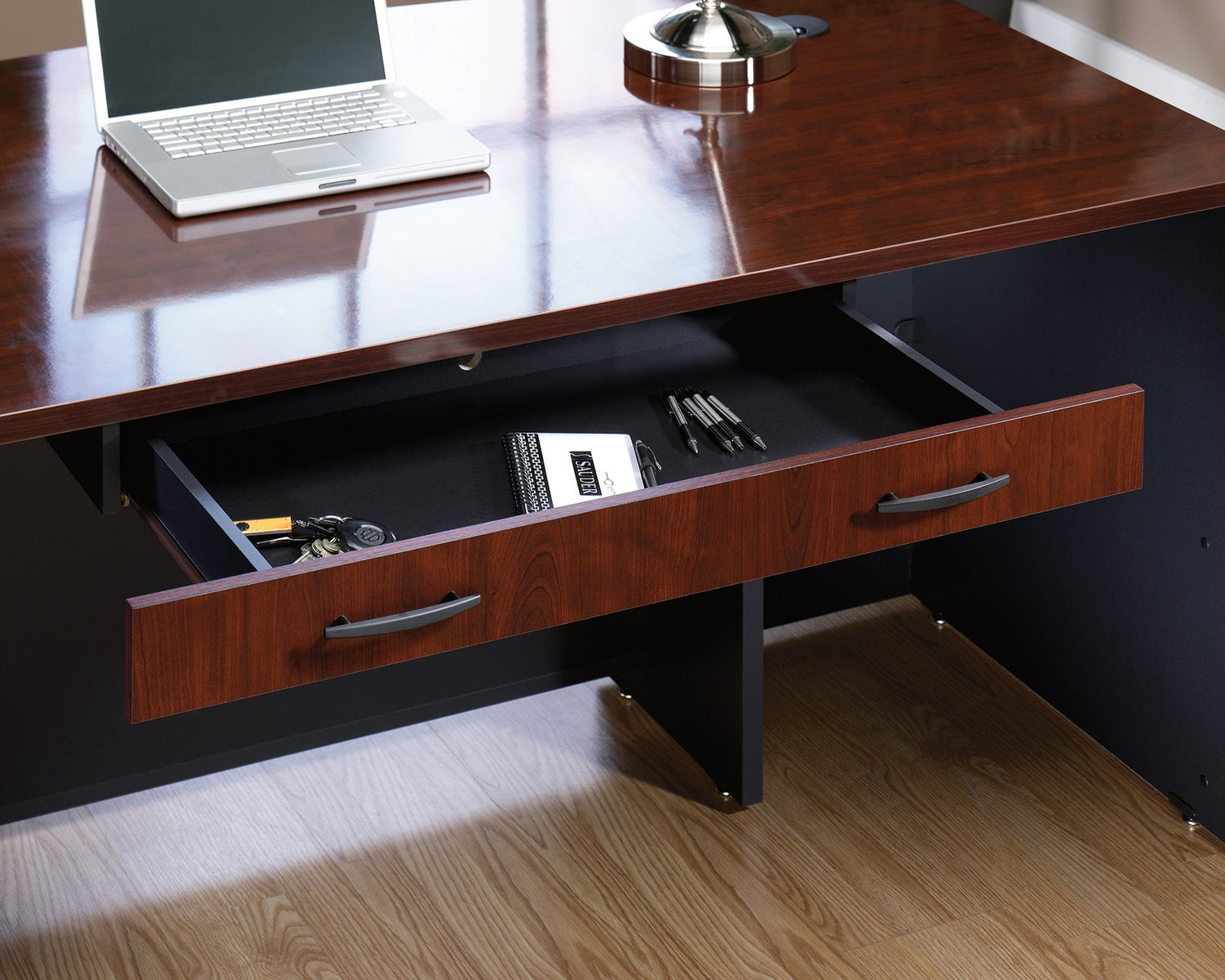 Enhance your executive workspace with the Via Pencil Drawer in Classic Cherry with Soft Black accents. This large, smooth-glide drawer provides convenient storage for pens, notepads, rubber bands, and other office essentials. The flip-down keyboard and mouse panel keeps your workspace organized and ergonomic. Detailed with attractive hardware, this pencil drawer complements your desk while offering practical storage solutions, making it an ideal accessory to keep your office tidy, stylish, and efficient.