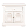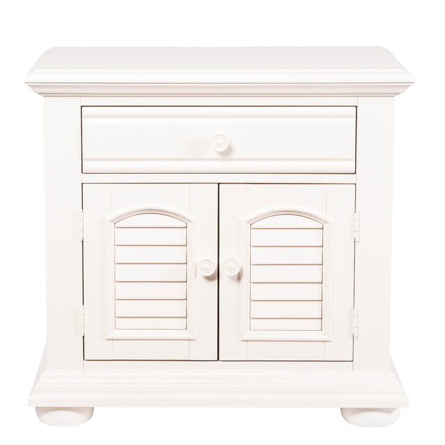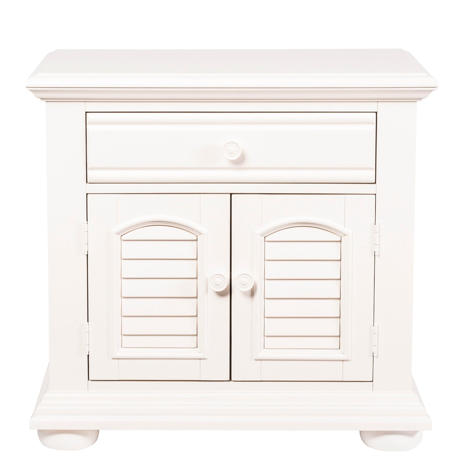 Obtain a fashionable cottage look with this 1 drawer, 2 door night stand. The oyster white finish is accented by louvered panels and wooden knob hardware. Storage abounds with the felt lined top drawer and adjustable shelf behind the two doors.