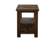 1 Drawer Table. The Dutton Occasional Tables Collection is a masterpiece of country cottage style, symbolizing stability and rootedness in an ever-changing world. Designed with both style and utility in mind, these tables feature visible wood grain and natural knots that add texture and authenticity to each piece. The rich brown stain highlights the beauty of the wood while enhancing its rustic and timeless appeal. The chairside table features one drawer and one open shelf. This clever design enhances functionality while keeping the space organized. The Dutton Occasional Tables Collection complements a range of interior styles, bringing a touch of rustic sophistication to any setting.