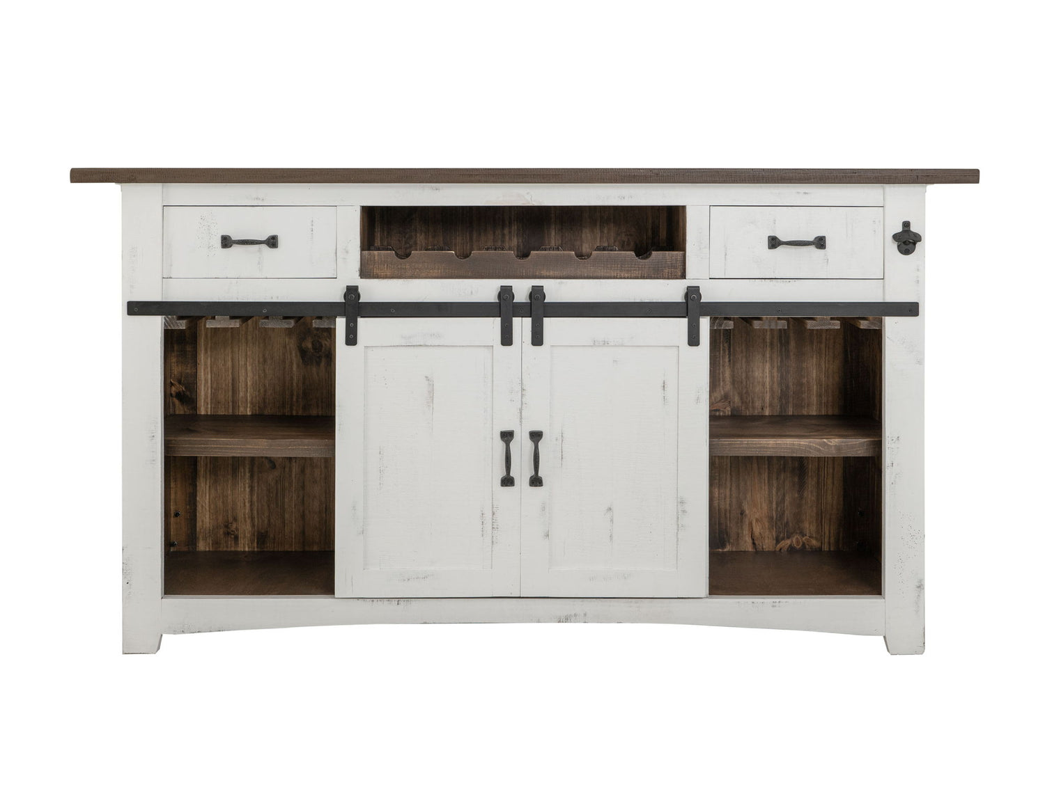 2 Drawer, 2 Shelves & 2 Doors Bar. Introducing our Pueblo collection, crafted from solid pine wood. This rustic collection is the perfect addition to bring your dream space to life. It features a hand-distressed finish on the tops.
