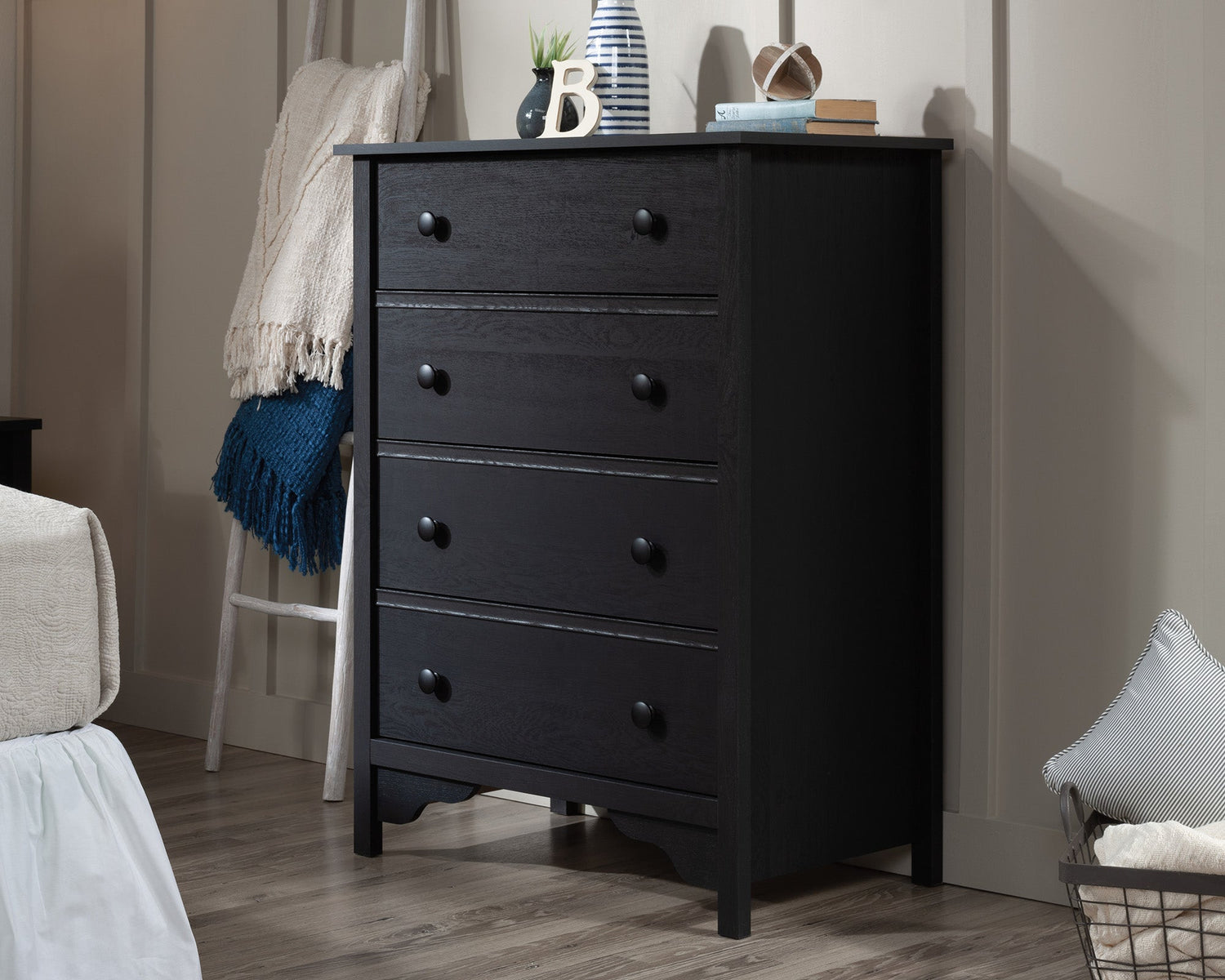 The Dawson Trail 4-Drawer Chest combines a deep Raven Oak finish with timeless country-chic styling. Its elegant design enhances any bedroom décor while providing functional storage and a traditional aesthetic for master bedrooms, guest rooms, or other spaces.