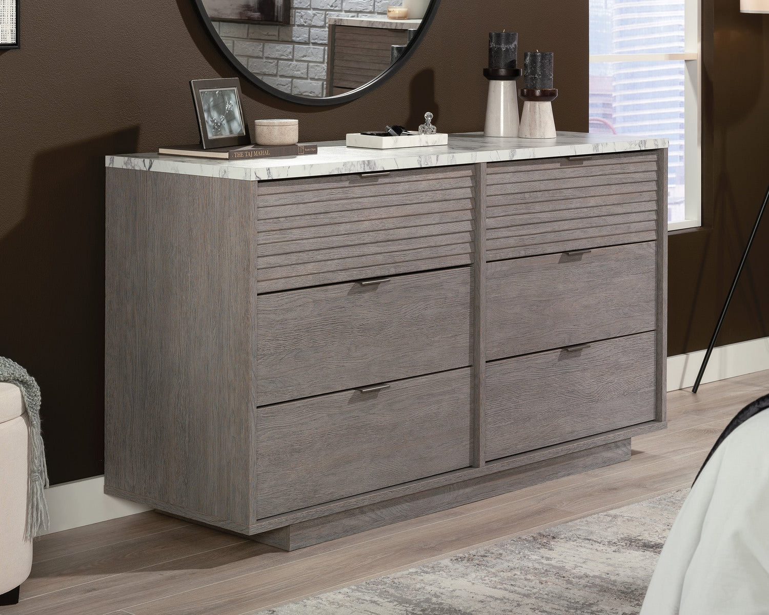 Enhance your bedroom with the East Rock 6-Drawer Dresser in Ashen Oak with DuraGraph faux white marble accents. Six smooth-glide drawers provide generous storage for clothing, pajamas, and bed linens, keeping your space tidy and organized. The spacious top surface is ideal for displaying décor, personal items, or accent lighting. Finished on all sides, this dresser can be positioned anywhere in your bedroom for versatile placement. The T-lock drawer system ensures drawers operate smoothly and securely, letting you enjoy your dresser immediately. Combining contemporary style with practical storage, this dresser adds both elegance and functionality to your home.