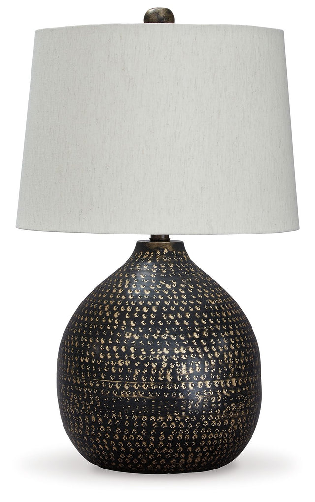Infuse your home with the casual vibe of this table lamp. Its black finish is elevated with a goldtone circular pattern. The lamp's slightly urban industrial design brings balance and brightness to your room with double the style.